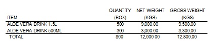 item란에 표기할 때 ALOE VERA DRINK 1.5L(20bottels/1box) 이런 식으로 나타내도 됩니다.